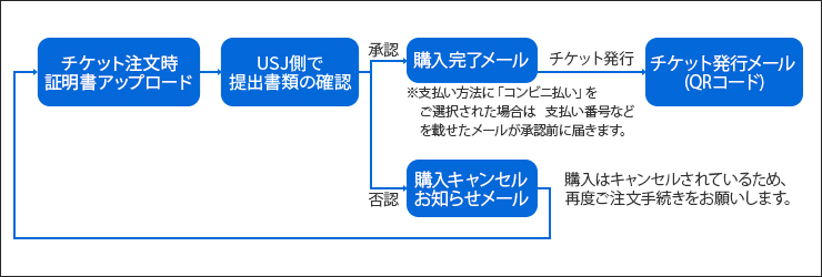添付写真ファイルが承認できなかった場合、ご購入時のメールアドレスへ証明書が承認不可によるご注文キャンセルのお知らせメールが届きます。その際にはご注文自体が取り消しになっているため、再度チケットのご注文からお進みください。証明書が必要なチケット・クーポンと同時にご注文いただいた内容はすべてお取り消しになります。