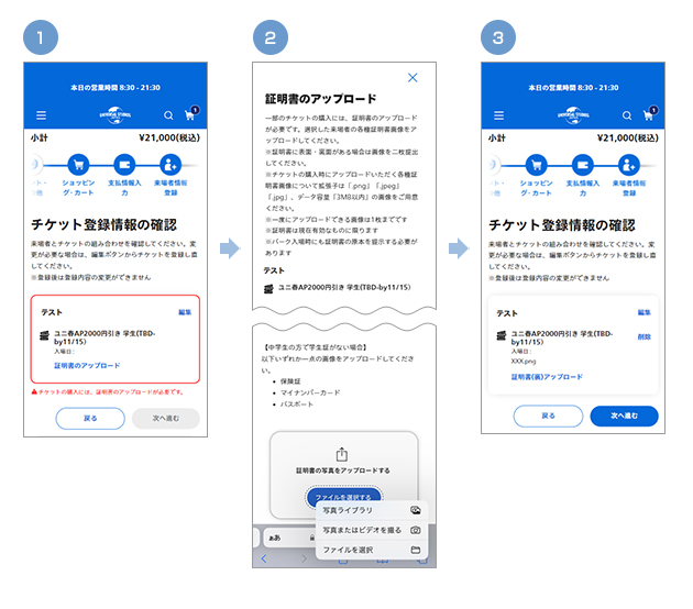 - ※チケットの購入時にアップロードいただく各種証明書画像について拡張子は「.png」「.jpeg」「.jpg」、データ容量「3MB以内」の画像をご用意ください